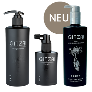 O ginseng silvestre é considerado há 5.000 anos a planta medicinal mais valiosa do mundo, e seu valor era comparado ao do ouro. A planta leva sete anos para desenvolver toda a sua densidade nutricional de 250 ingredientes. Crescendo selvagem e encontrada apenas em três pequenas regiões da Coreia do Sul, esta preciosa substância é colhida manualmente e posteriormente processada para os produtos de cuidados exclusivos GINZAI, especialmente concebidos para as necessidades da pele e do cabelo europeus. O processo G-Hiexponential, desenvolvido por nós e particularmente suave, garante que os ingredientes ativos especiais da raiz tenham uma alta biodisponibilidade e possam ser absorvidos de forma ideal pelos cabelos e pelo couro cabeludo. Com seu efeito adaptogênico, o ginseng preto da floresta também se adapta às necessidades do cabelo, oferecendo assim uma ampla gama de aplicações para todos os tipos de cabelo. Ele combate suavemente todos os problemas capilares e restaura o equilíbrio natural do cabelo.