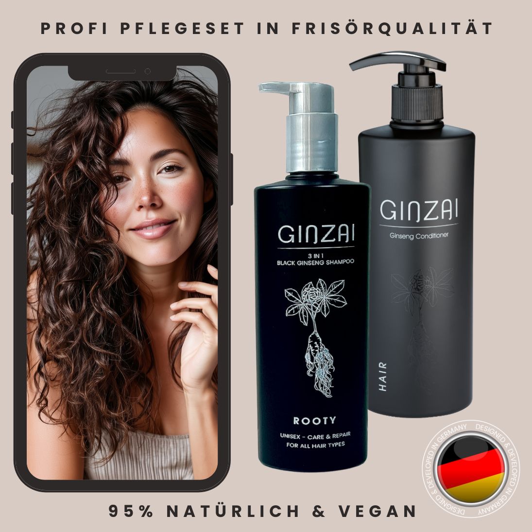 O shampoo ROOTY 3 em 1 com ginseng preto limpa, cuida e acalma o couro cabeludo, promovendo um cabelo forte e saudável. O ginseng preto e os valiosos extratos vegetais e de raízes de qualidade orgânica nutrem as raízes e os fios com ingredientes da mais alta qualidade. ROOTY hidrata o couro cabeludo, previne o aparecimento de cabelos grisalhos e promove o crescimento de cabelos saudáveis e fortes. O condicionador ativa as raízes capilares para um cabelo forte e saudável. O ginseng preto da floresta, o extrato da raiz da árvore japonesa e o Oriental Complex patenteado nutrem e cuidam do seu cabelo com ingredientes de alta qualidade. O condicionador hidrata o cabelo, forma uma barreira protetora contra influências externas e evita a formação de pontas duplas ou quebra do cabelo. Após 6 semanas de uso, melhorias significativas são visíveis e palpáveis e, após 6 meses, um efeito duradouro é alcançado.