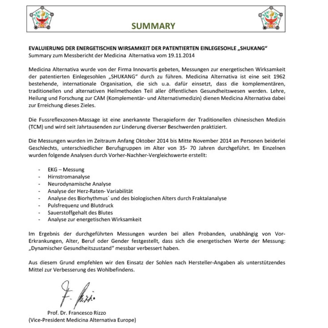 O efeito das palmilhas SHUKANG foi avaliado pela MEDICINA ALTERNATIVA, uma organização de medicina alternativa fundada em 1962. Resultado: