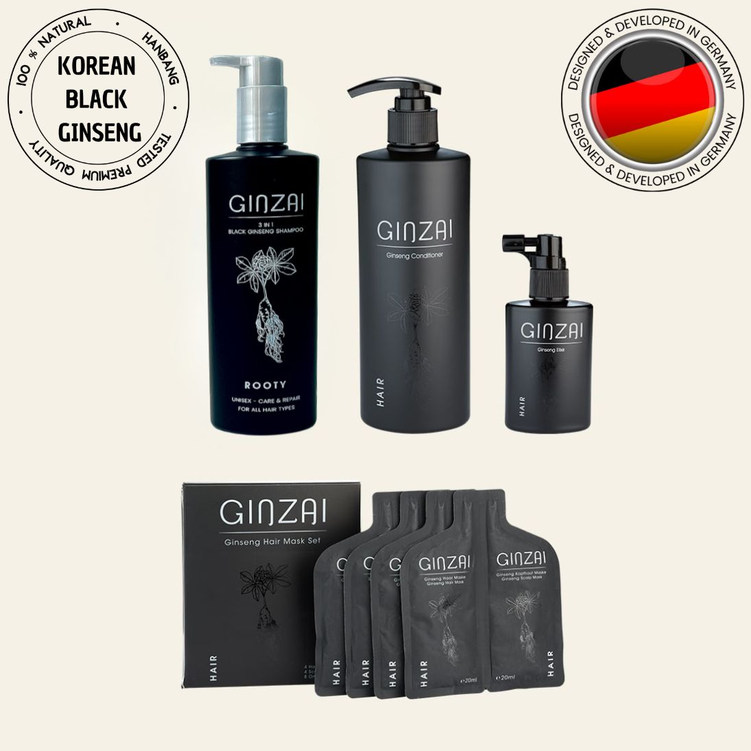 O ginseng silvestre é considerado há 5.000 anos a planta medicinal mais valiosa do mundo, e seu valor era comparado ao do ouro. A planta leva sete anos para desenvolver toda a sua densidade nutricional de 250 ingredientes. Crescendo de forma selvagem e encontrada apenas em três pequenas regiões da Coreia do Sul, esta preciosa substância é colhida à mão e posteriormente processada para os produtos de cuidados exclusivos GINZAI, especialmente concebidos para as necessidades da pele e do cabelo europeus. O processo G-Hiexponential, desenvolvido por nós e particularmente suave, garante que os ingredientes ativos especiais da raiz tenham uma alta biodisponibilidade e possam ser absorvidos de forma ideal pelos cabelos e pelo couro cabeludo. Em particular, com este processo, conseguimos reforçar o efeito dos ginsenosídeos relevantes para a saúde do cabelo e, assim, alcançar resultados extraordinários em termos de cuidados e estimulação. Com seu efeito adaptogênico, o ginseng preto da floresta também se adapta às necessidades do cabelo, oferecendo assim uma ampla gama de aplicações para todos os tipos de cabelo. Ele combate suavemente todos os problemas capilares e restaura o equilíbrio natural do cabelo.